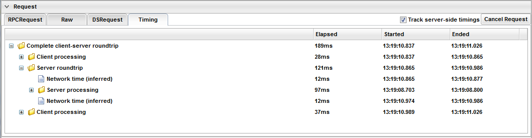 roundtrip, a DSRequest to a clientOnly DataSource or a direct request to a webservice. Request queues are shown as separate entries,